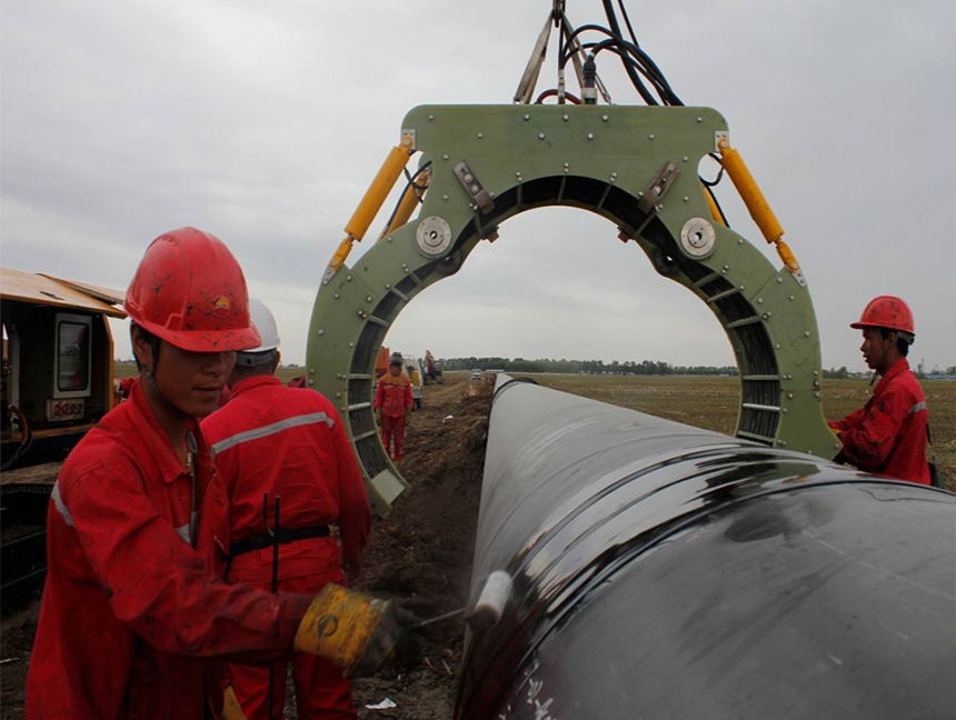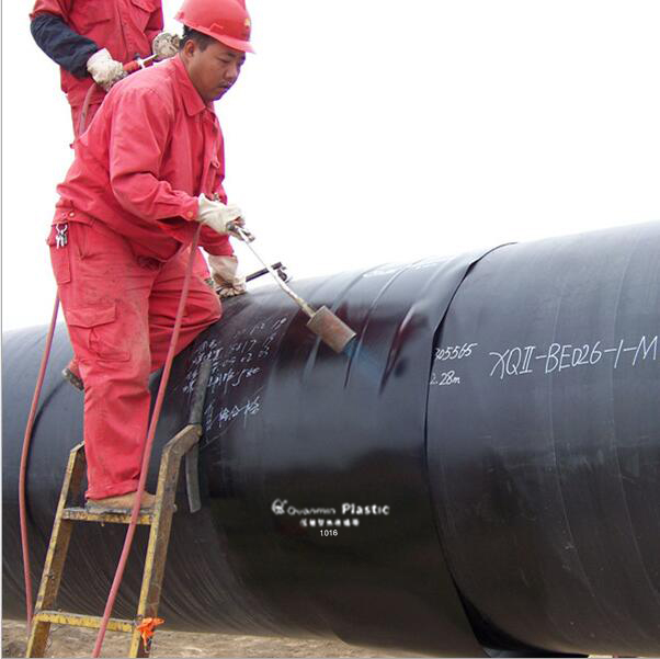 3、用烤槍(汽油噴燈)將待防腐段預熱至產品要求溫度,將熱縮套移至防腐段,用木楔等物支撐,盡量使套與鋼管同心。注意熱縮套與鋼管預制防腐層搭接應不小于50m,